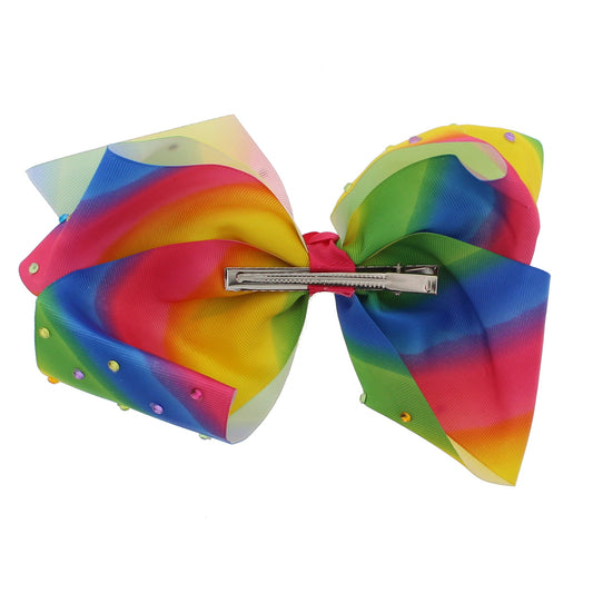 Very Large Bright Rainbow Jojo Style Ribbon Bows with Multicolour Stones (23 x 18cm)