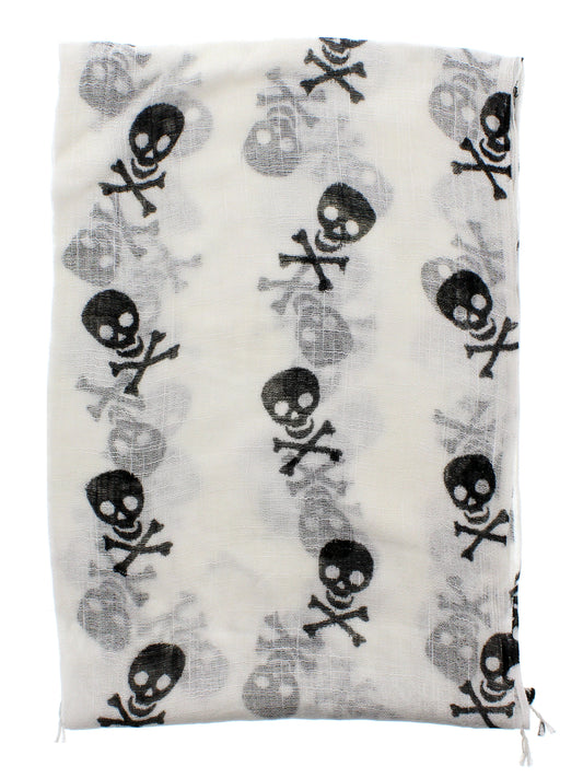 White Linen Look Scarf with Black Skull & Crossbones