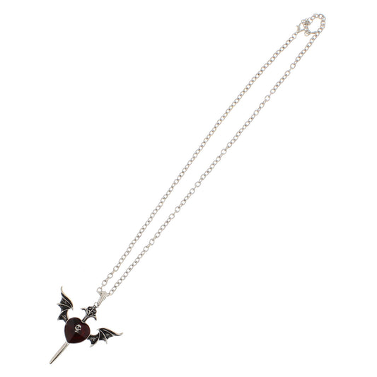 Winged Dagger with Ruby Red Crystal Heart & Mini Skull on Rhodium Metal Chain Necklace (4cm Pendant)